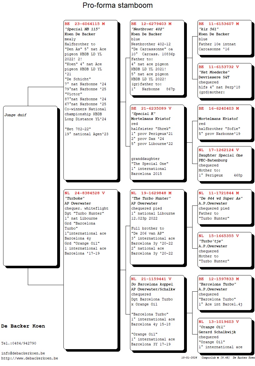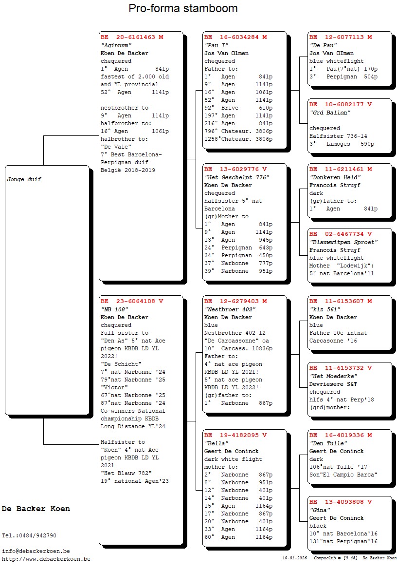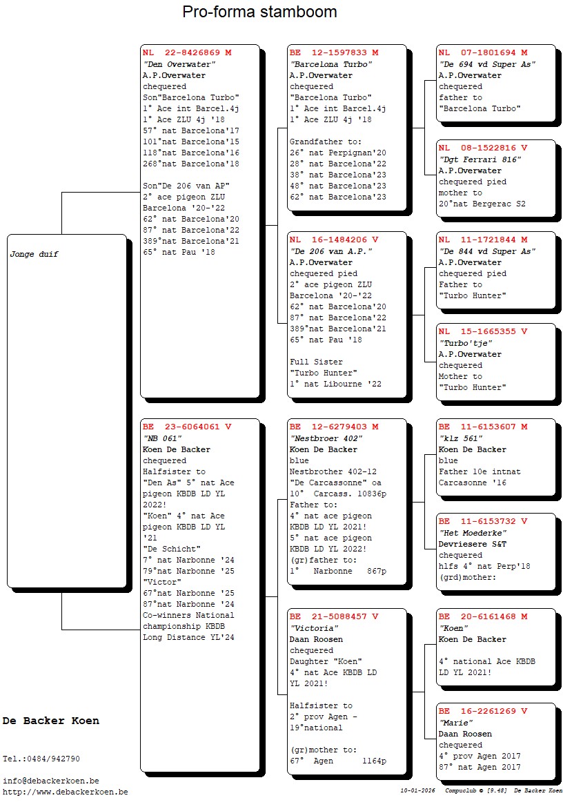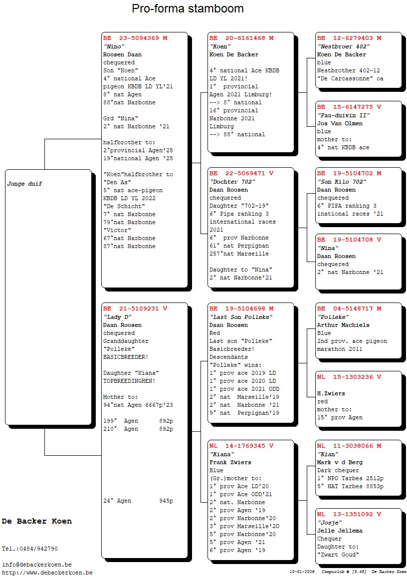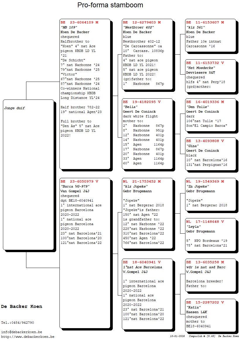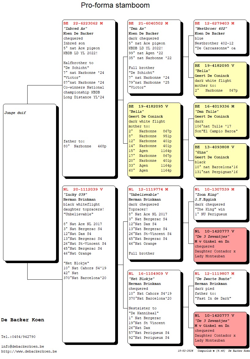 “NB 109”, Halfbroer 4e nationale asduif grote fond jaarlingen KBDB 2021, Volle broer “Den As” 5e nationale asduif grote fond jaarlingen KBDB 2022, volle broer 7e, 67, 79e, 87e nat Narbonne, uit “Nestbroer 402”
