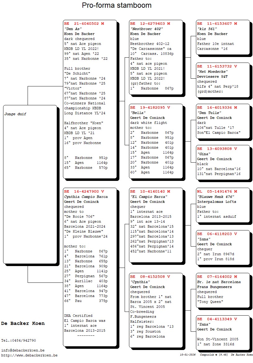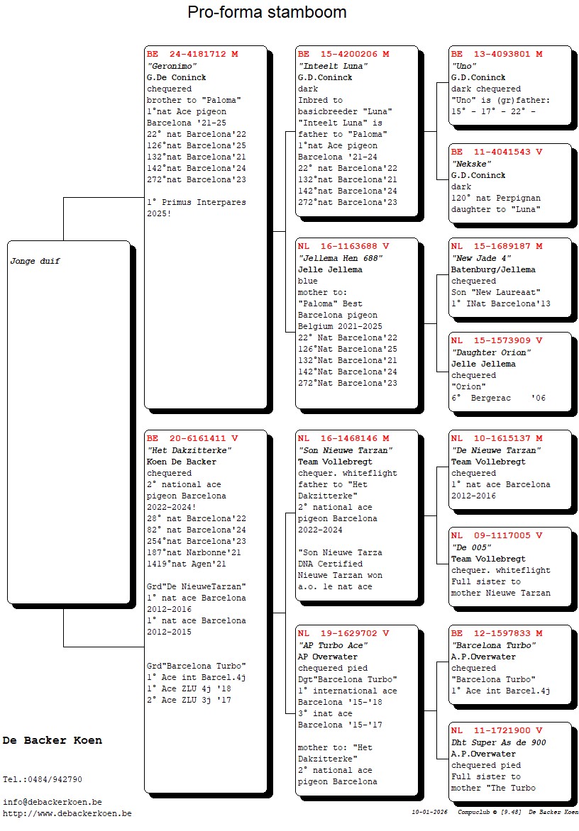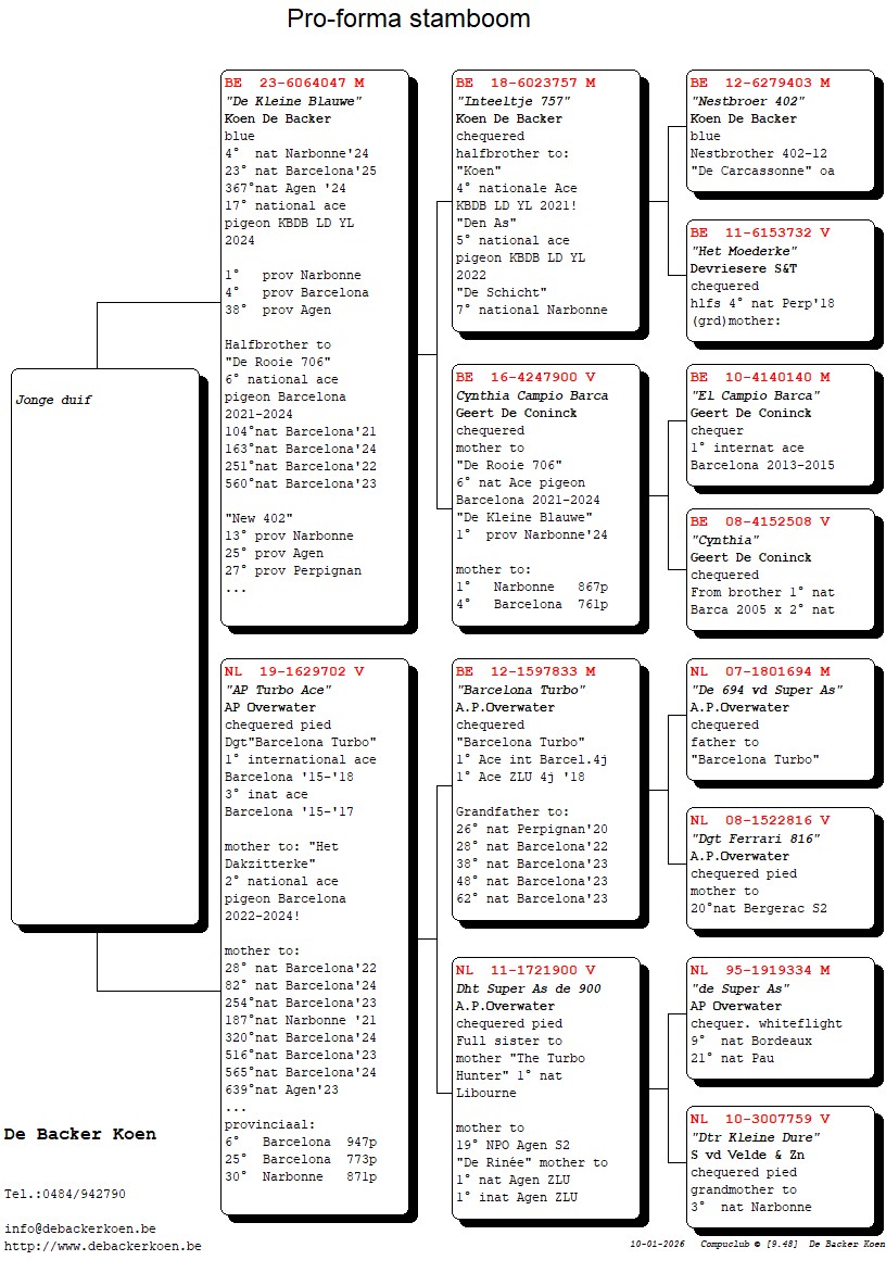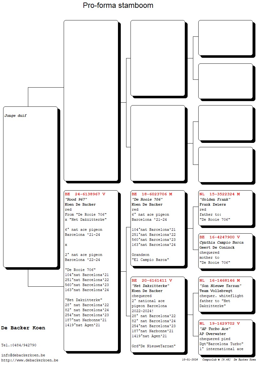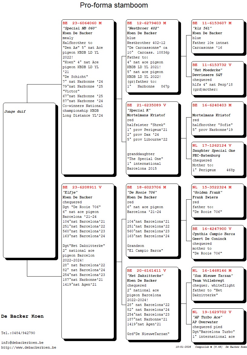 “Elfje”, Dochter “Het Dakzitterke” 2e nationale asduif Barcelona 2022-2024, dochter “De Rooie 706” 6e nationale asduif Barcelona 2021-2024