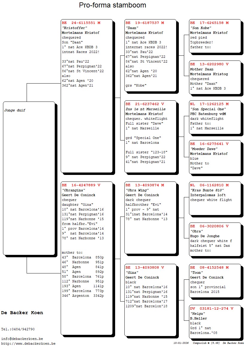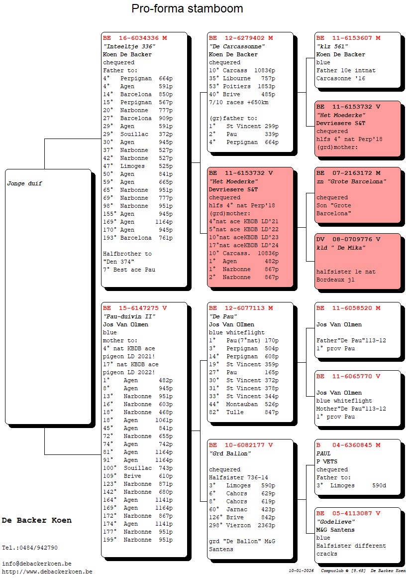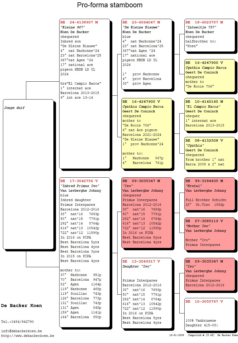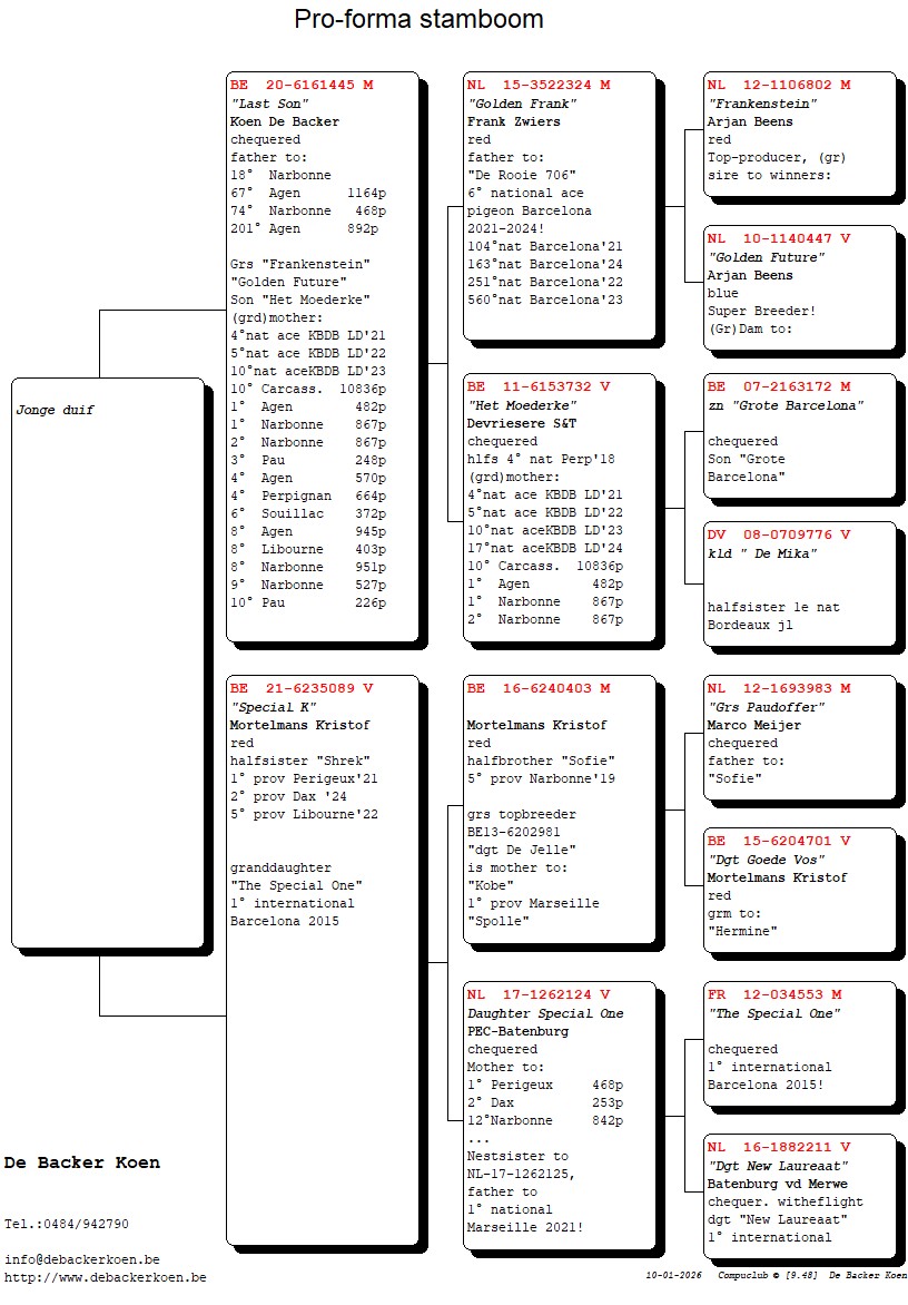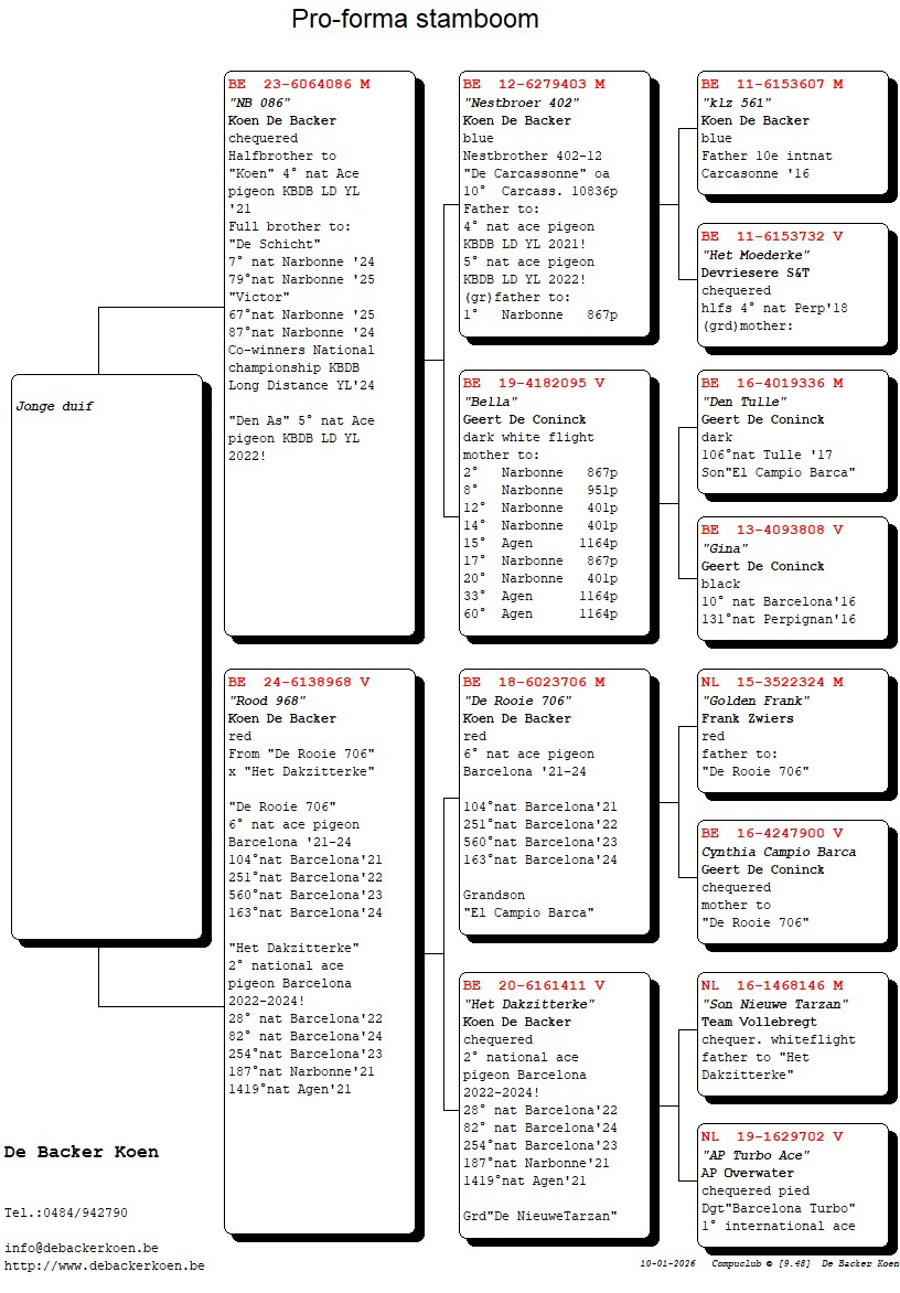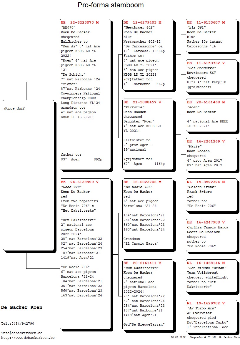 “Elfje”, Dochter “Het Dakzitterke” 2e nationale asduif Barcelona 2022-2024, dochter “De Rooie 706” 6e nationale asduif Barcelona 2021-2024
